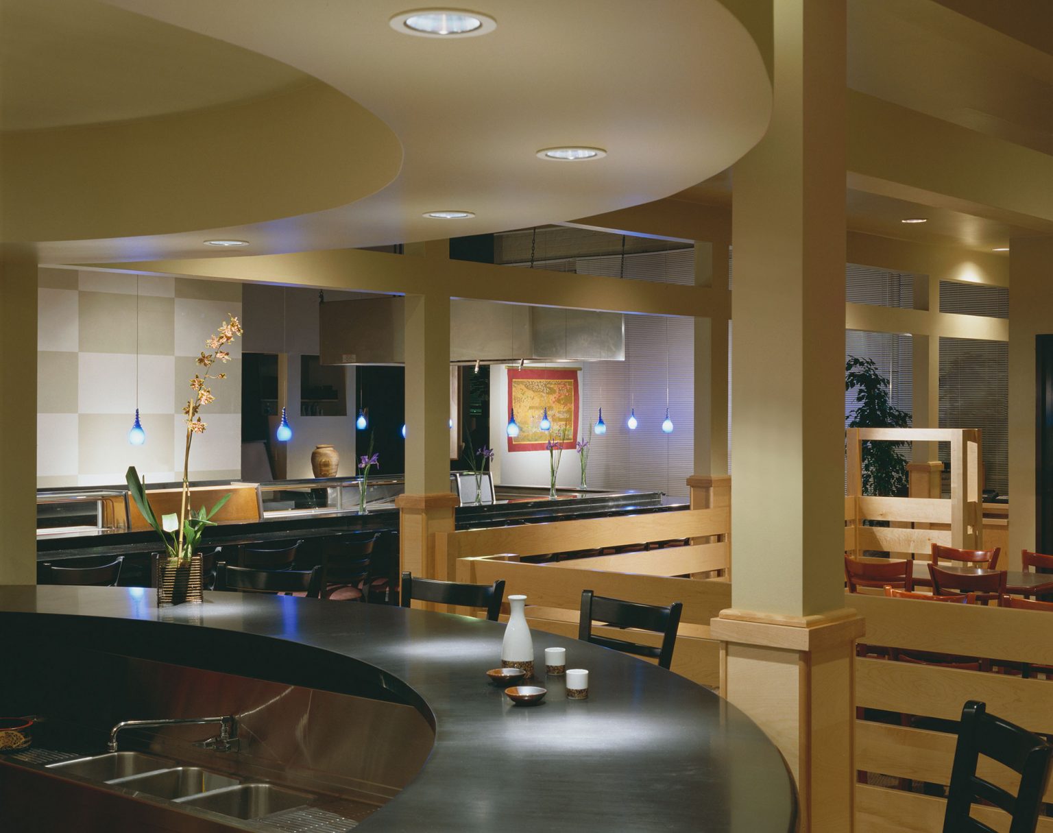 The project was to remodel the existing, already very successful restaurant in Berkeley. New colors and materials were introduced and low fences were designed to clarify circulation from seating areas. A new sake tasting bar was added as a circular element that pivots circulation behind from a waiting area and the restrooms. Extensive neighborhood meetings were held on Sundays to ensure participation to solicit opinions to control restaurant parking in adjacent residential neighborhoods.