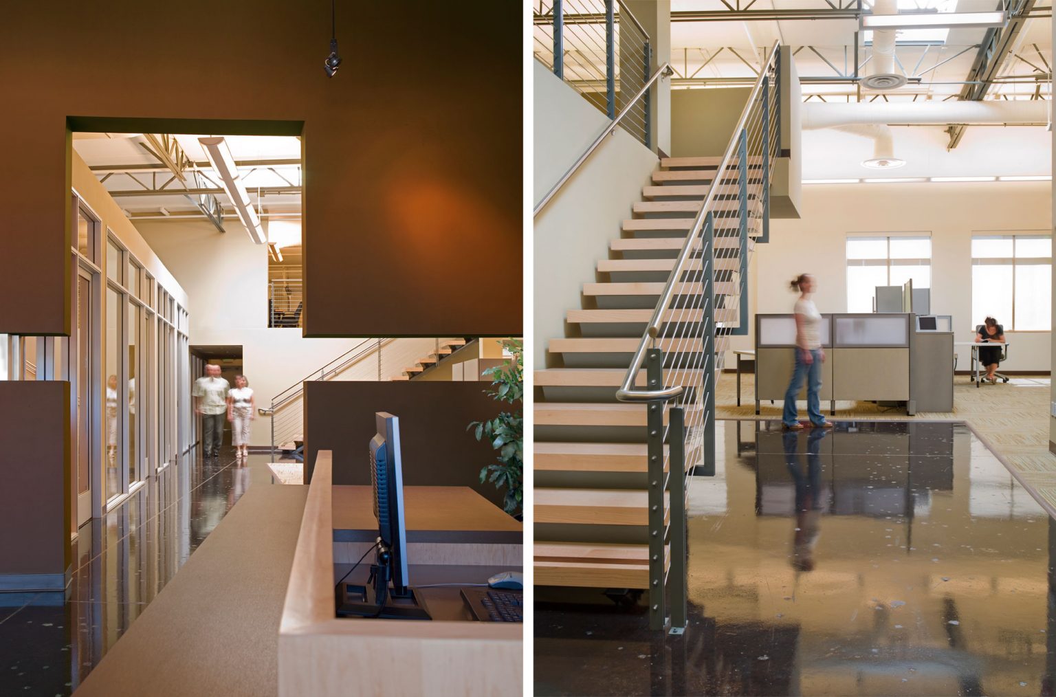 The open office environment sits on an island of neutral-toned carpet tiles laid in a crisscross pattern, while the circulation areas are of highly polished concrete floors. Bright red stools dot the landscape. The mezzanine stair landing sits perched on a single column planted in the concrete floor. Navajo’s theme is reflected in the warm colors balanced by the cool tones of Haworth’s open office systems, which have translucent upper panels for privacy and openness. Both task chairs and conferences chairs have open weave back supports. From the main conference room, big doors and windows give generous views to the office interior. Brightly colored stools brighten up the break area, which has a roll-up garage door to let the outside in on sunny days..